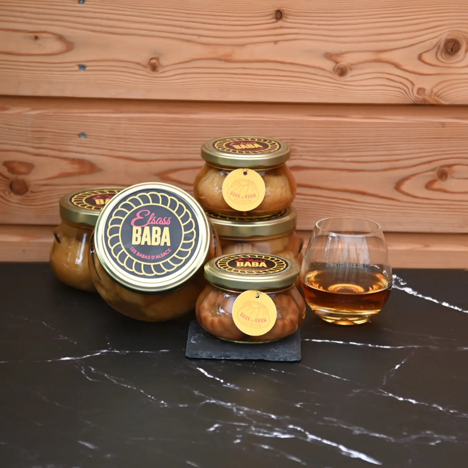Baba au rhum – Elsass Baba : un dessert artisanal alsacien présenté en bocal, composé de cinq babas moelleux imbibés d’un sirop au rhum. Intense et parfumé, il se déguste nature ou accompagné de glace, chantilly ou fruits exotiques. Une spécialité conviviale et authentique.