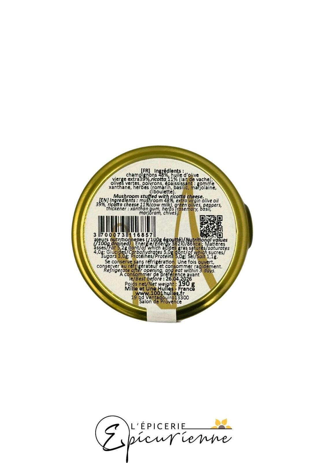 champignons farcis à la ricotta Mille et Une Huiles, champignons farcis, antipasti italiens, ricotta farcie, spécialité italienne, champignons apéritif, champignons gourmands, tapas italiens, antipasti raffinés