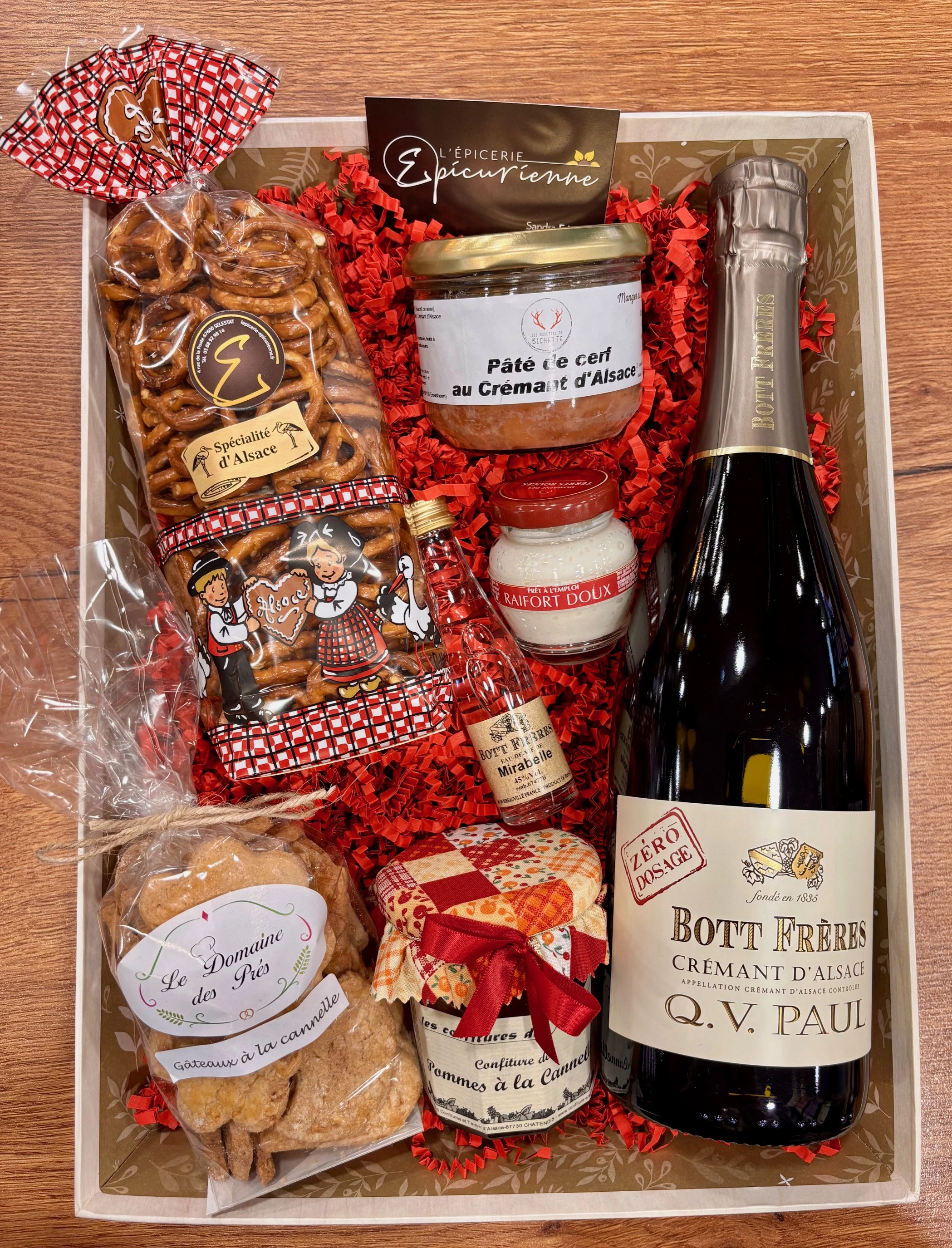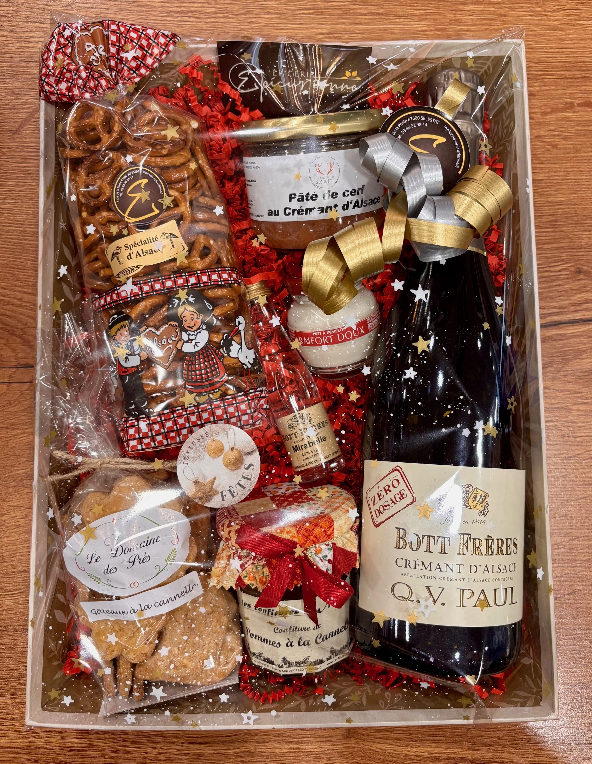 Notamment, vous découvrirez un Crémant d’Alsace AOC en bouteille de 75cl. De plus, nous avons sélectionné des spécialités de gibier sauvage des forêts alsaciennes. Enfin, les célèbres brédala de Noël à la cannelle complètent ce voyage gustatif.