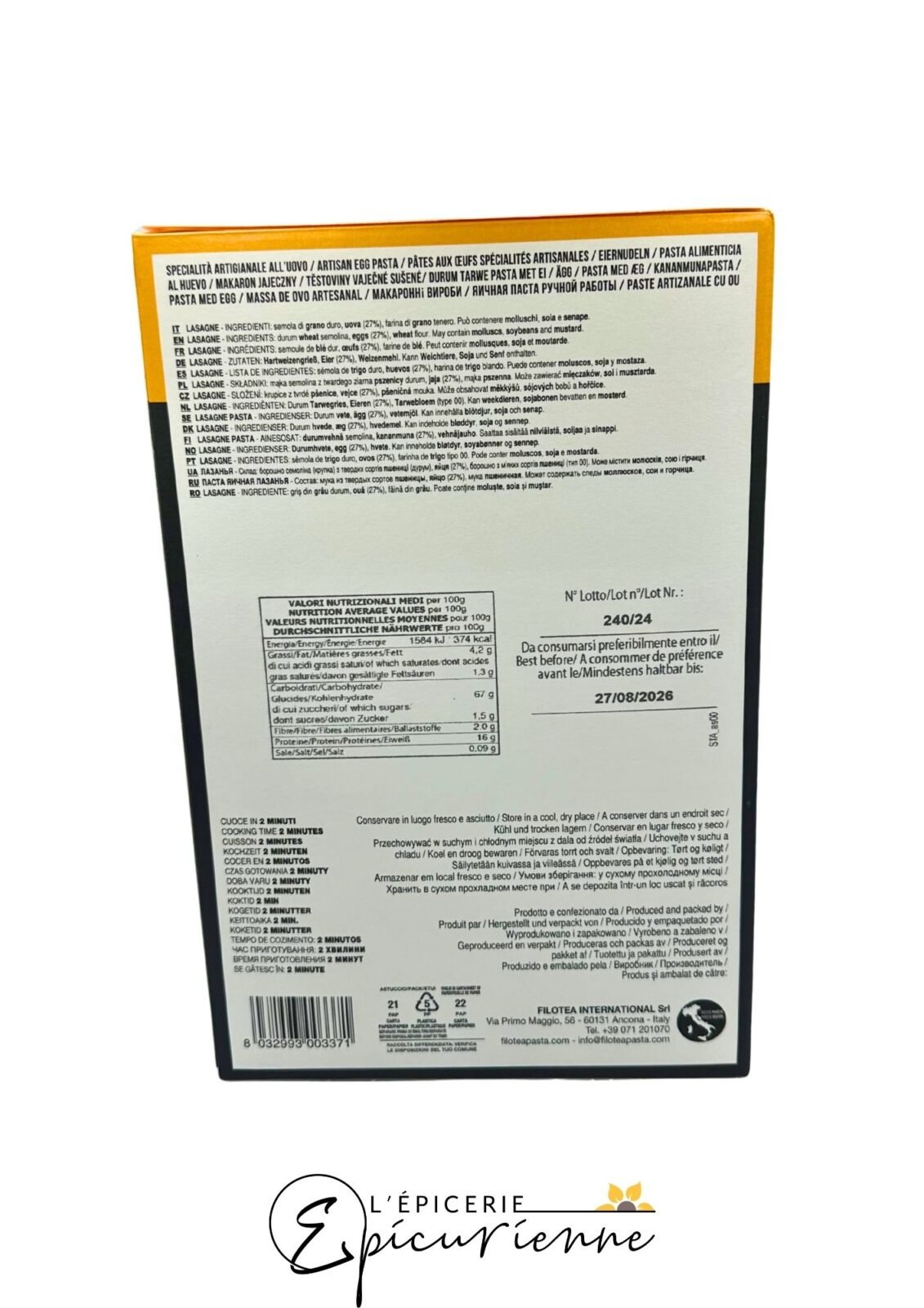 Les Lasagne artisanales – Filotea incarnent le raffinement de la cuisine italienne. Issues d’une recette originelle des Marches, elles sont élaborées à partir de semoule de blé dur, farine 00 et œufs (27 %). Ainsi, chaque feuille révèle une texture ferme et fondante à la fois. De plus, elles n’ont pas besoin d’être précuites, ce qui simplifie leur préparation, tout en assurant un résultat goûteux et authentique.