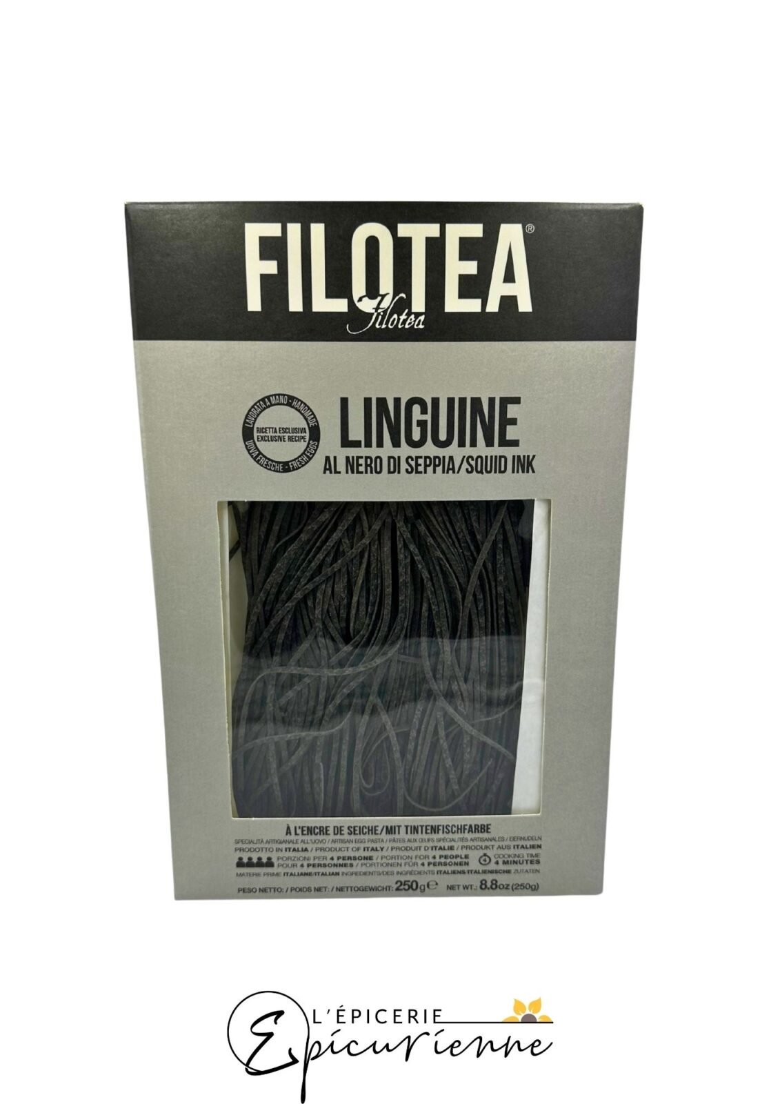 Linguine à l’encre de seiche – Filotea – 250 g : pâtes italiennes artisanales aux œufs et encre de seiche, al dente et parfaites avec sauces de fruits de mer ou crème citronnée.