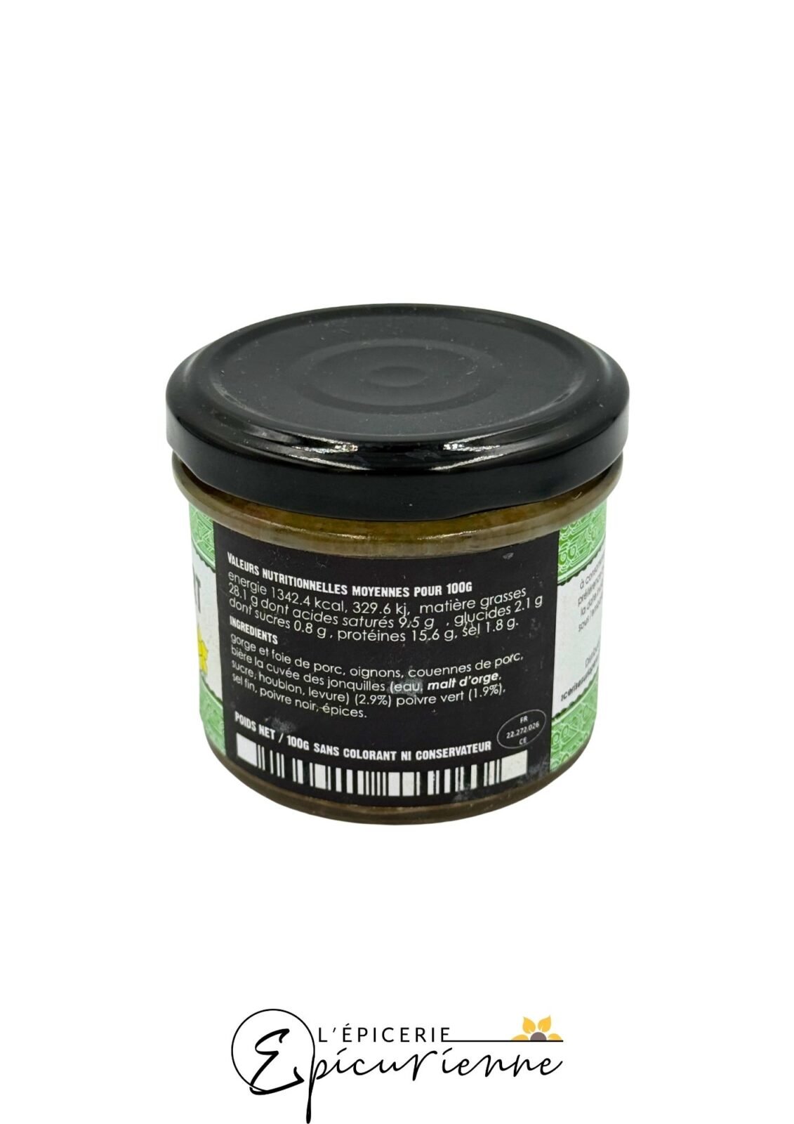 Fabriquée artisanalement dans les Hauts-de-France, cette terrine mise sur la qualité des ingrédients. Elle contient gorge de foie de porc, oignons, couennes de porc, bière Cuvée des Jonquilles (2,9 %), poivre vert (1,9 %), sel, poivre noir et épices précises :contentReference[oaicite:1]{index=1}. Aucun colorant ni conservateur n’y est ajouté, ce qui préserve l’authenticité du goût. La bière, brassée dans la région, apporte une note maltée et ronde qui équilibre la vibrance du poivre.